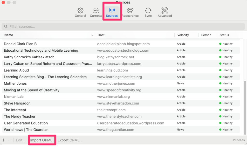 Current offers several ways to add sources. In the image above, my existing sources appear (all education blogs). At the bottom, there is an Import OPML button that allows the AI-created OPML file to be uploaded.