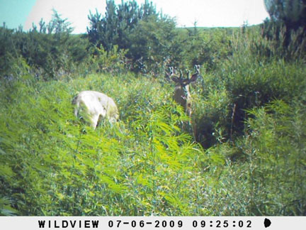 My brother Dan sent me another picture of deer captured with his trail camera. He says he has been watching this buck mature as the summer progresses. I find this fascinating. One hardly ever gets a good look at deer and he is collecting a series of images over time that shows the growth of the antlers.