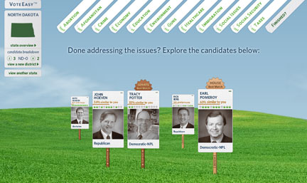 I really like this activity. You identify your state and then take a position and rate the importance of 10 issues. They tool then compares your data with those of the various candidates. Actually consider the issues – what a novel concept. VoteEasy