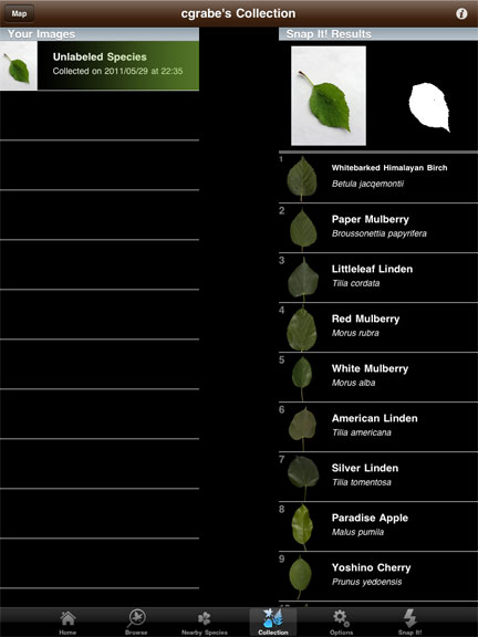 The identification guide resources we use may soon change. I ran across this iPad app on LifeHacker and had to give it a try. LeafSnap is an electronic field guide developed by researchers from several prestigious universities that allows you to both collect and identify specimens. Here is how the systems works for trees. You take a leaf and put it on a white background and then upload the image. The system makes an attempt to identify the tree and offers options. I do think the system got my test specimen correct because the tree did have white bark was probably a birch (we were staying at the home of relatives in northeast Minnesota).