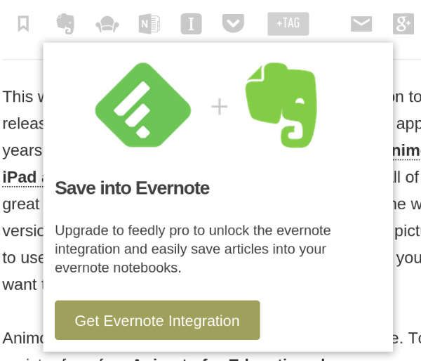 I do most of my reading using the iPad. When I attempted to use the Feedly to Evernote transfer I kept encountering an error message. No specific explanation for the error message, just an error message. I did eventually determine that you must purchase the Pro version of Feedly to enable this storage option. Feedly certainly does not owe me a free feature, but the app should explain the requirement for payment rather than generate an error message. It is obvious when attempting the same transfer on a laptop.