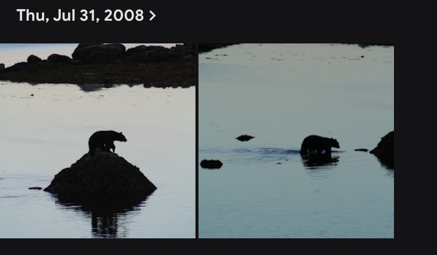 Here is the feature Google has added to photos that seems added just for my situation. You can now ask Gemini (AI), available within Photos, to perform a wide range of tasks based on your photo collection. First, the Ask feature does not presently work on a Macintosh, but does work with the Google Photos app on the iPhone or iPad. Ask appears at the bottom of the screen instead of the search icon, which may be confusing if you are used to the traditional search method. Entering the prompt “Find images of bears in my photo collection” creates a long list of hits – bears in zoos, a photo of a black bear carved from a tree stump, teddy bears being held by our kids, and all of the bear images taken in Alaska. I was able to locate one of the missing bear images as the bear approached the rock I could not find in any other way.