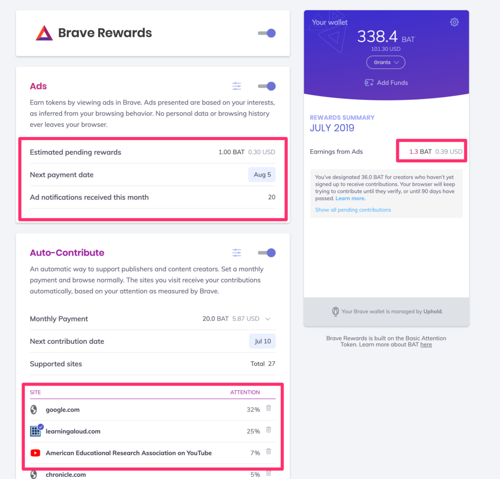 I have been using Brave for some time now as a personal experiment. I put in $50 to fund sites signing on with Brave and I am no enrolled in the compensation for viewing ads program. The following screen capture might give you some idea of the amount of money that is actually involved. Clearly, this is about micropayments, but the concepts are interesting. A problem of Brave at present is that the programs are specific to a given device. This severely limits both the allocation and the receipt of funds because many of us work on many different devices. The exchange of funds at present also does in work with phones and tablets. These changes are coming.