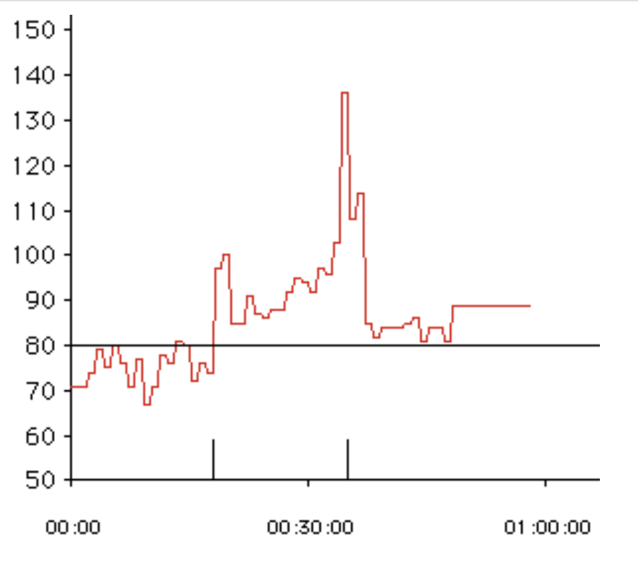 The data generated clearly demonstrate the stress heat imposes on the body. The data are graphed in the image that appears below. Note the two marks on the x-axis. These marks indicate the transitions between stages of our experiment. The middle segment of the graph, the time during which Mark was in the hot water, demonstrates an elevated and accelerating heart rate. Note irregularities in the data appearing near the transitions between stages of the experiment. During these transitions, Mark was in his swimming suit working to remove and then reattach the hot tub cover with an air temperature of 20°F.
